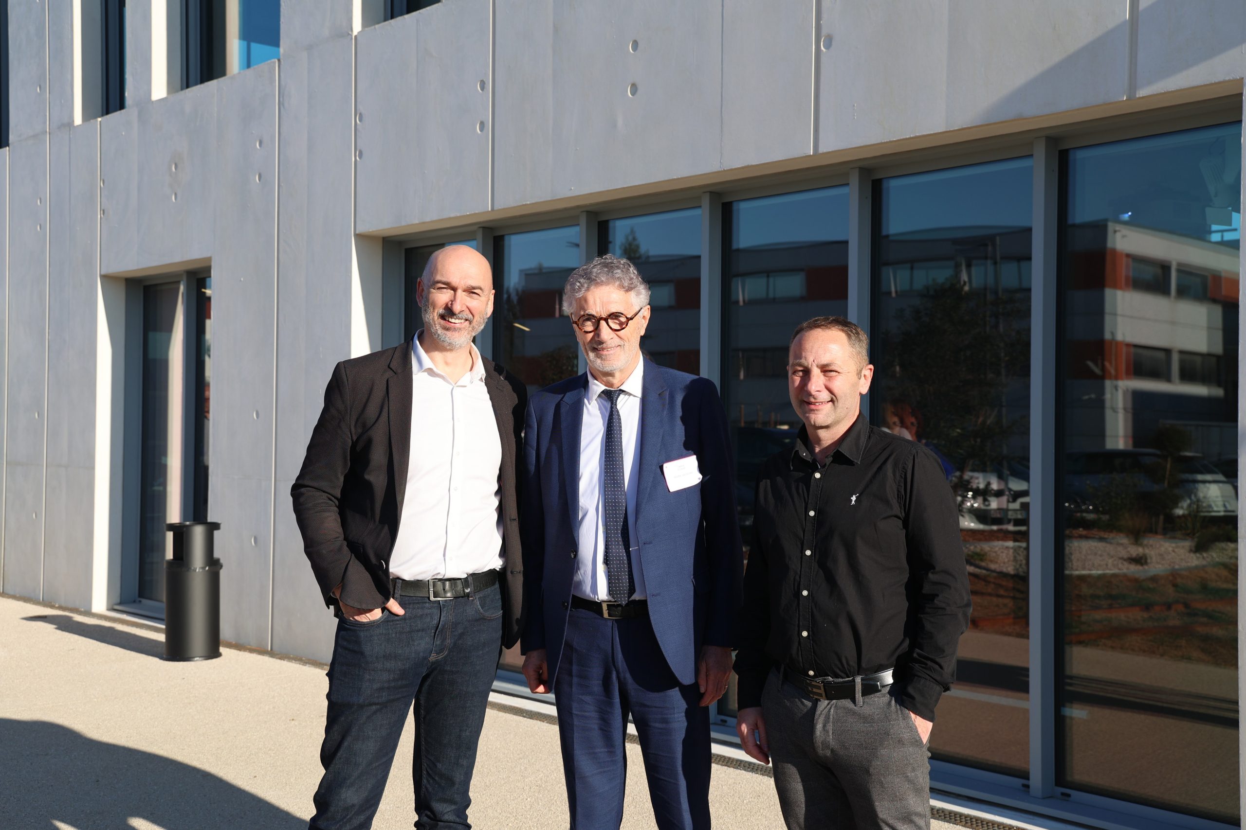 Sur la photo: Emmanuel Mouton, dirigeant de Synox, Gérard Sigaud, 1er Adjoint au Maire de Castelnau-le Lez à l’attractivité économique, à l’innovation et au numérique et Jérôme Fenwick, CTO de Synox (©DR source: https://www.castelnau-le-lez.fr/)